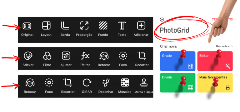 Você aprenderá a usar todas as ferramentas do App Photogrid (GRADE, EDITAR, DIVIDIR, MAIS FERRAMENTAS) 👉 Layout, Borda, Proporção, Fundo, Texto, Adicionar, Sticker, Filtro, Ajustar, Efeitos, Retocar, Foco, Recortar, Girar, Desenhar, Mosaico, Marca d’água