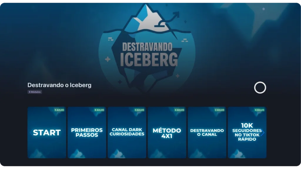 O Destravando o Iceberg (CRIAÇÃO DE CONTEÚDO), como é oficialmente chamado na plataforma de vendas Cakto, é um treinamento online completo focado na criação e monetização de vídeos curtos para o YouTube Shorts e TikTok. O curso é desenhado para guiar o aluno desde a concepção do canal até as estratégias avançadas de monetização.