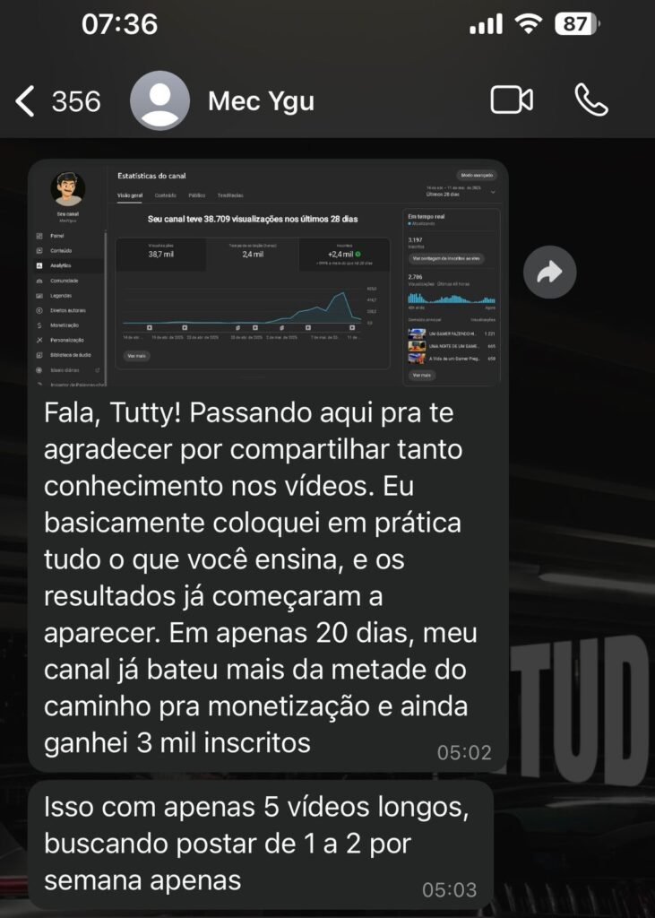 A autoridade de Tutty vem da sua própria jornada e dos resultados expressivos que obteve, transformando seu conhecimento em um método replicável. Ao adquirir o curso, os alunos têm acesso não apenas a um conteúdo teórico, mas à experiência prática de quem vive do YouTube. Você aprende direto com o Tutty, em videoaulas gravadas em ótima qualidade, tudo que ele tem feito em seus próprios projetos.